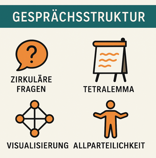 Diese Methode macht sichtbar, dass mehr Optionen bestehen als bisher gedacht – und dass jede Position ihre Berechtigung hat. In moderierten Gesprächen kann das Tetralemma auch als Bodenanker oder visualisiert mit Symbolen genutzt werden.